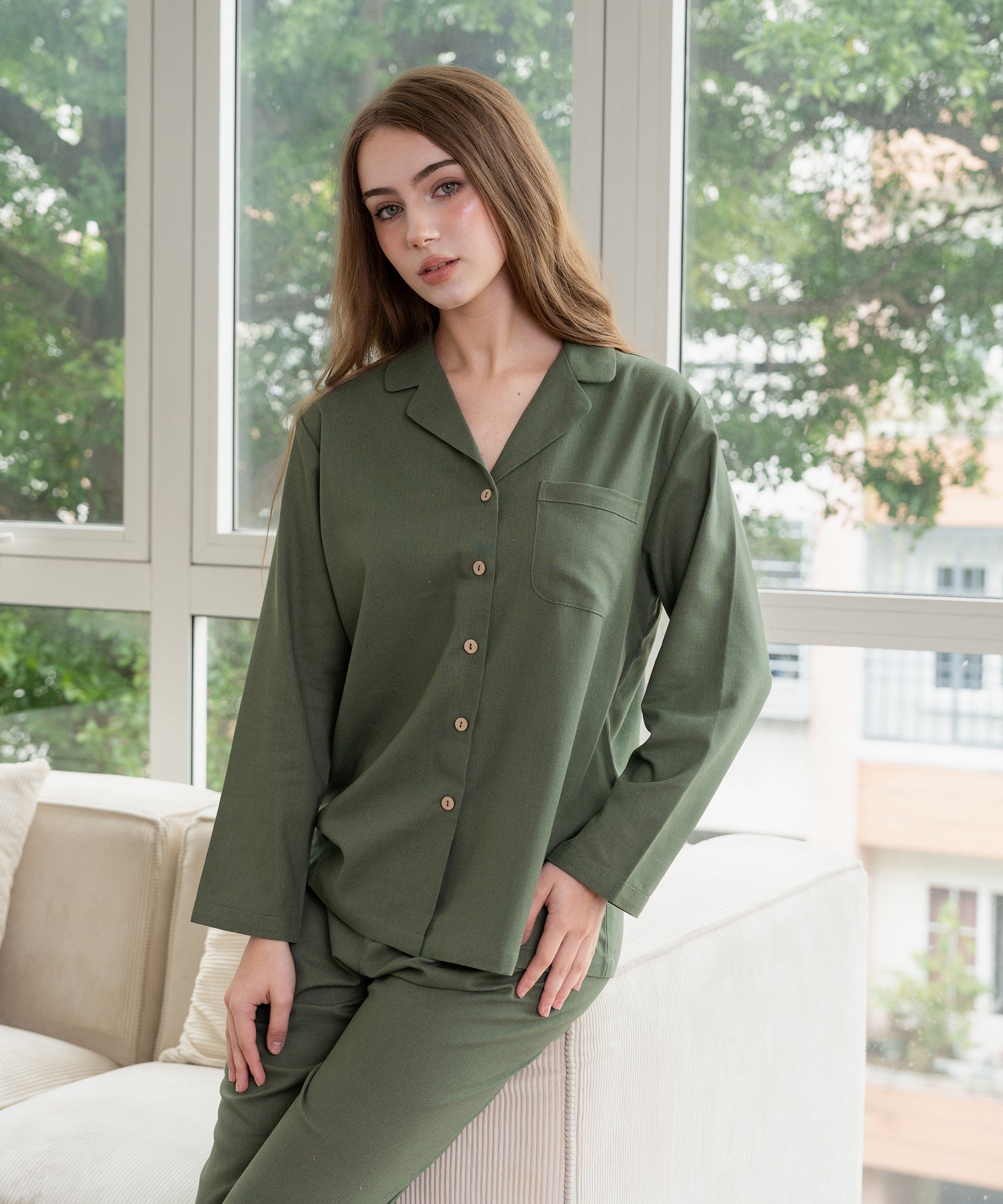 Relax in timeless comfort with this linen long sleeve pajama set. Designed for cooler nights, this 2-piece set features a long sleeve button-down shirt and full-length matching pants. Crafted from soft and durable linen, it’s breathable yet cozy – making it perfect for year-round lounging and sleep.