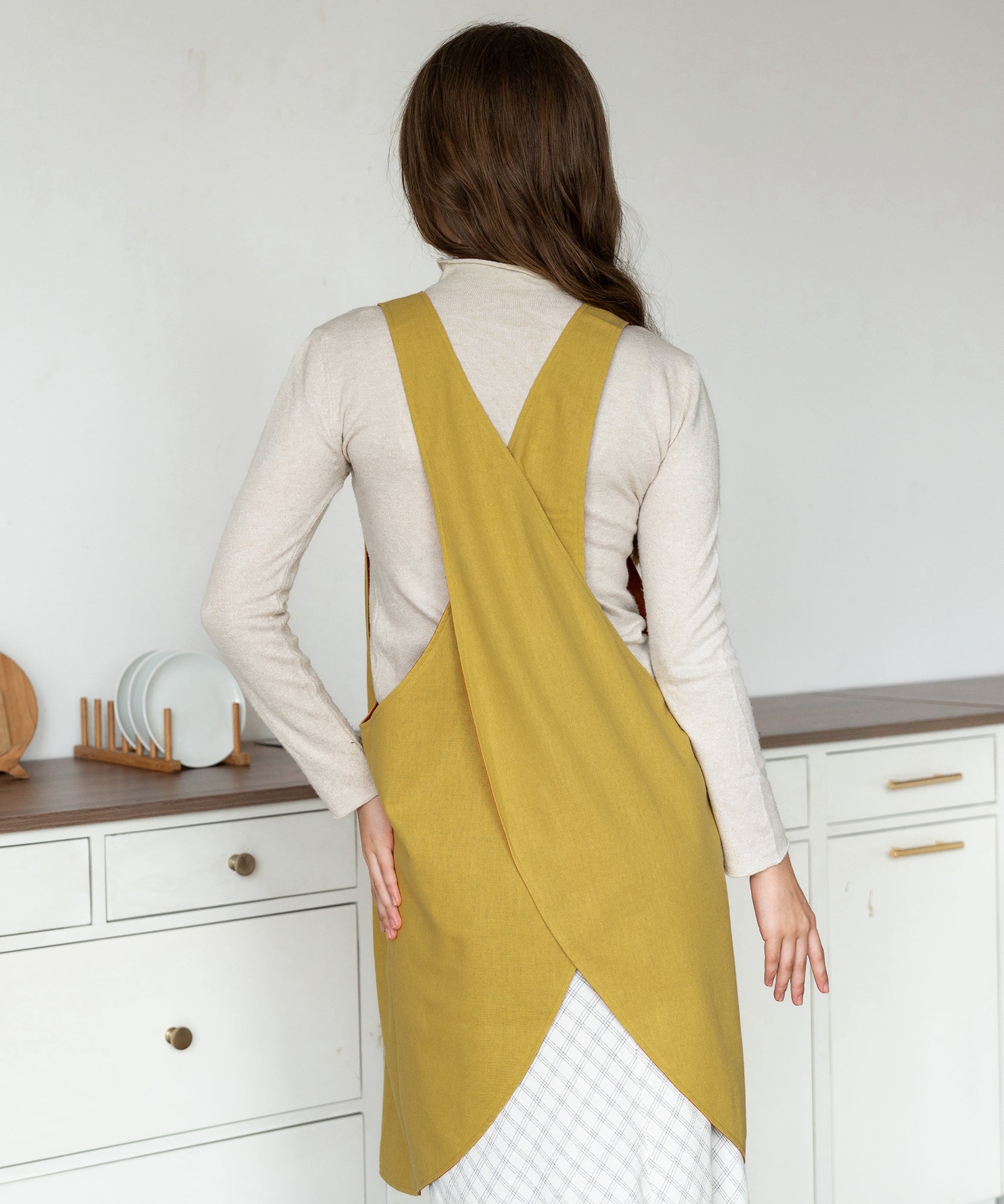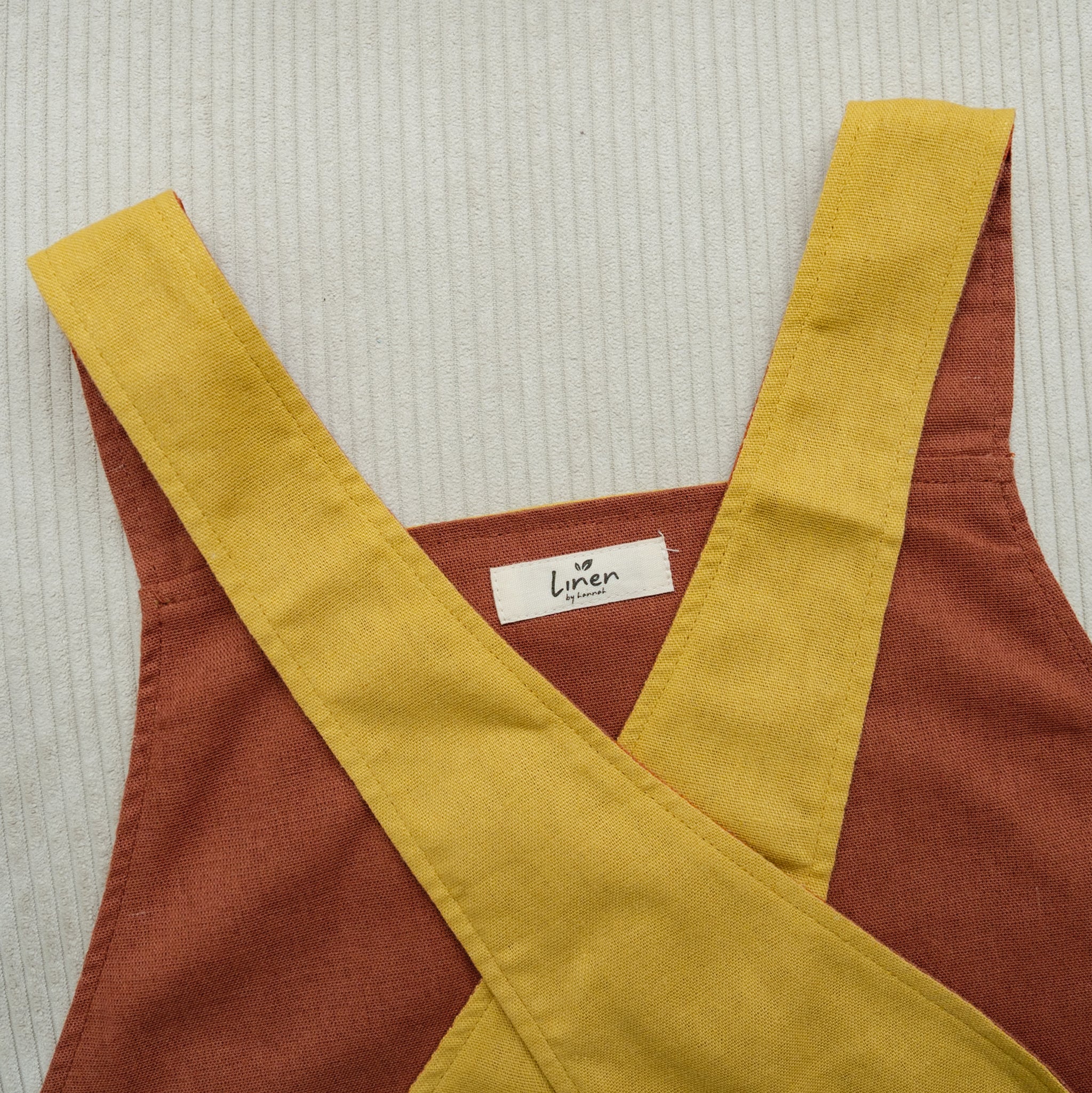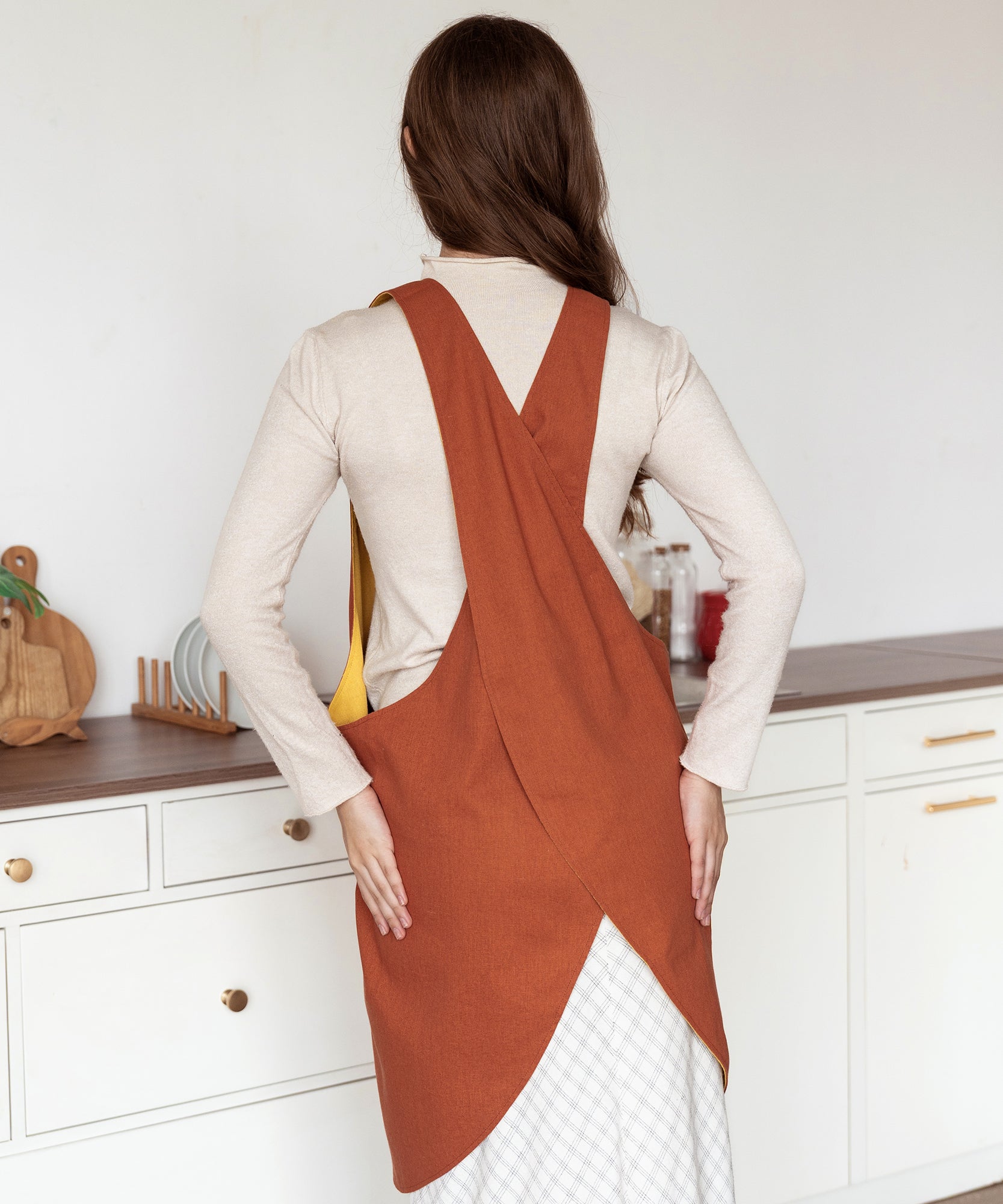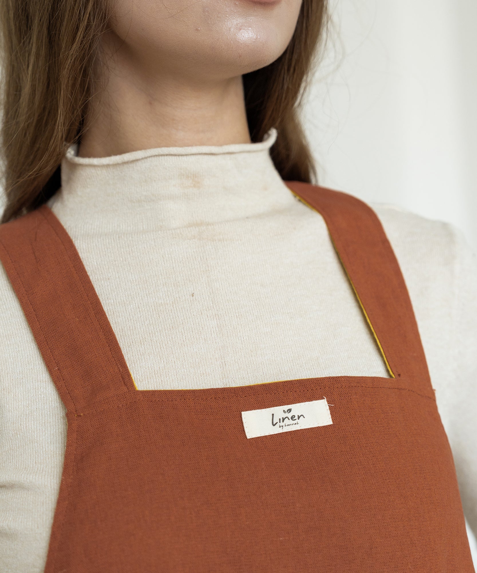 Discover the perfect balance of style and practicality with this reversible linen apron – designed with two layers of fabric so you can wear it on both sides. Each side features a charming color combination, giving you the flexibility to switch up your look anytime.