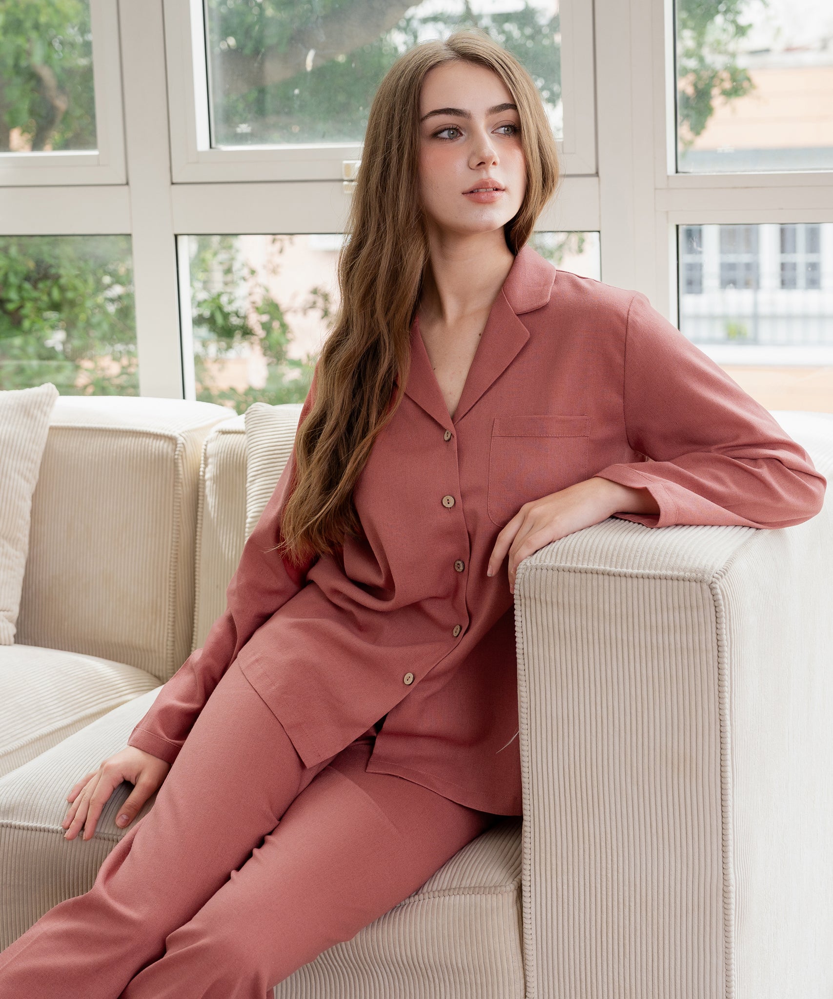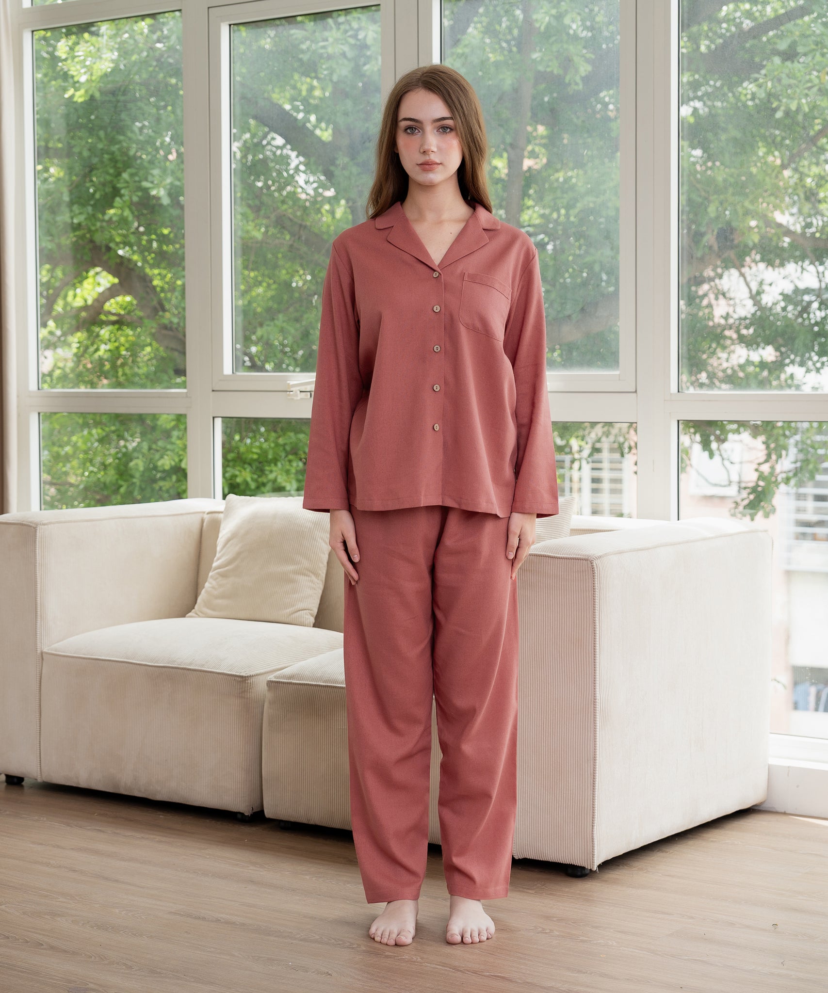Relax in timeless comfort with this linen long sleeve pajama set. Designed for cooler nights, this 2-piece set features a long sleeve button-down shirt and full-length matching pants. Crafted from soft and durable linen, it’s breathable yet cozy – making it perfect for year-round lounging and sleep.